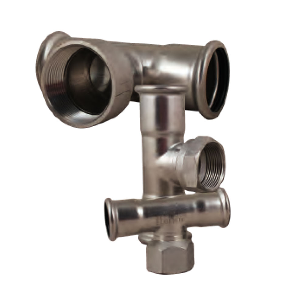 Para derivar una línea a 90º, con salida a rosca y sin interrumpir el trayecto original. Puede derivar a igual o distinto diámetro.