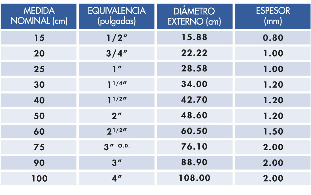 Medidas de 1/2″ a 4″ según la tabla